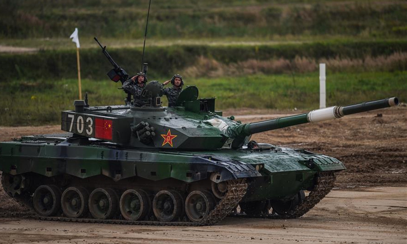 Chinese team takes part in the tank biathlon's singles during the International Army Games 2020 in a suburb of Moscow, Russia, Aug. 30, 2020. Photo: Xinhua
