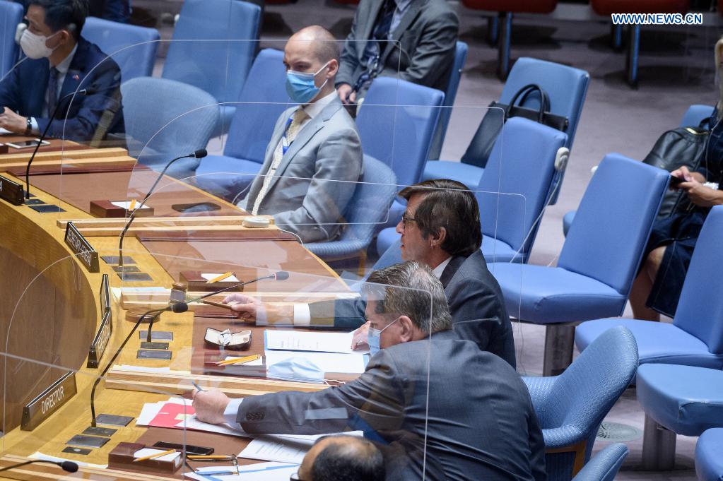 A United Nations Security Council meeting is held at the UN headquarters in New York, on July 29, 2021. United Nations Security Council on Thursday adopted a resolution extending for one year its arms embargo on the Central African Republic (CAR) - as well as a travel ban and assets freeze imposed on certain individuals and entities, as designated by its sanctions committee - and renewing for 13 months the mandate of the Panel of Experts tasked with assisting that body. (Loey Felipe/UN Photo/Handout via Xinhua)