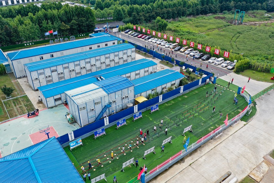 Aerial photo taken on July 29, 2021 shows staff members of a firm waiting in line for nucleic acid test at a testing site in Nanjing, capital of east China's Jiangsu Province. (Xinhua/Ji Chunpeng)