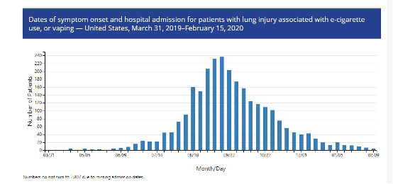 Another hint of doubt is the case numbers and hospital admissions for EVALI. The shape of the curve (see chart) illustrated by the CDC showing the number of patients admitted to the hospital is suspiciously similar to the epidemic curve of an infectious disease like COVID-19 or Ebola, where case numbers and hospitalizations grow steadily for a period before reaching a peak and then flattening.