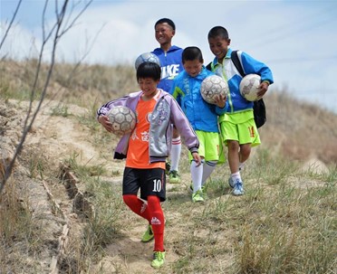 Photo taken in May 2016 shows students at Zhonglianchuan Primary School in northwest China’s Gansu province on their way to football practice after school. (Photo by Chen Bin/Xinhua)