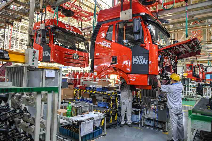 Workers assemble vehicles at the general assembly line of FAW Jiefang, a truck-manufacturing subsidiary of First Automotive Works (FAW) Group Co. Ltd., in Changchun, northeast China's Jilin Province, Sept. 1, 2020. (Xinhua/Zhang Nan)