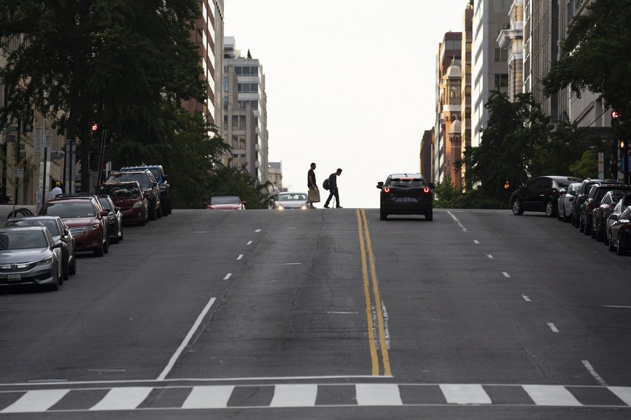 People walk across a street in Washington, D.C., the United States, July 13, 2021. (Xinhua/Liu Jie)