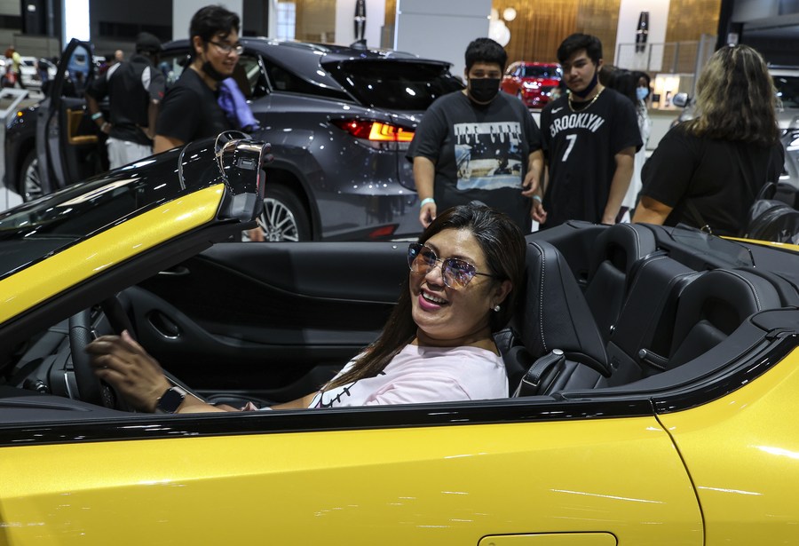 A visitor is seen in a 2021 Lexus LS 500 convertible at the 2021 Chicago Auto Show held at McCormick Place in Chicago, the United States, on July 15, 2021. (Photo by Joel Lerner/Xinhua)