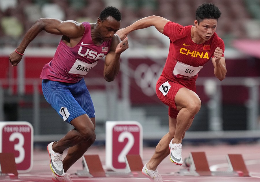 Su Bingtian (R) of China competes during the Men's 100m Final at the Tokyo 2020 Olympic Games in Tokyo, Japan, Aug. 1, 2021. (Xinhua/Ju Huanzong)