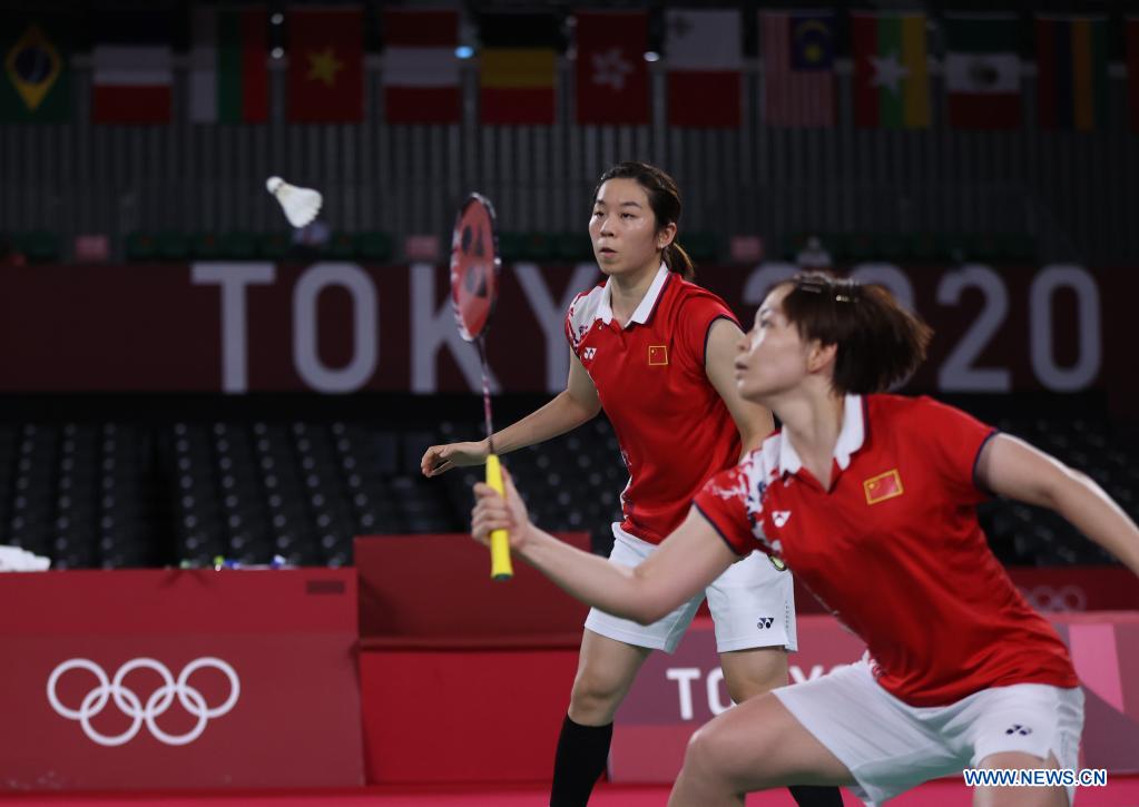 Chen Qingchen/Jia Yifan (L) of China compete during the badminton women's doubles gold medal match between Chen Qingchen/Jia Yifan of China and Greysia Polii/Apriyani Rahayu of Indonesia at the Tokyo 2020 Olympic Games in Tokyo, Japan, Aug. 2, 2021. (Xinhua/Ou Dongqu)