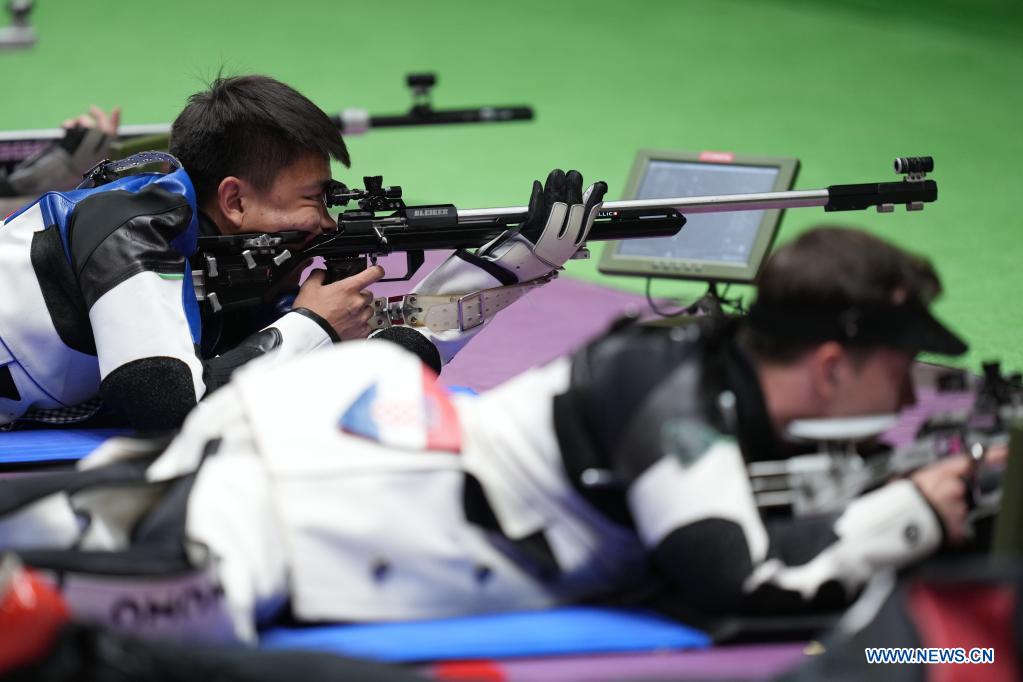 Zhang Changhong (L) of China competes during the 50m rifle 3 positions men's final at the Tokyo 2020 Olympic Games in Tokyo, Japan, Aug. 2, 2021. (Xinhua/Ju Huanzong)