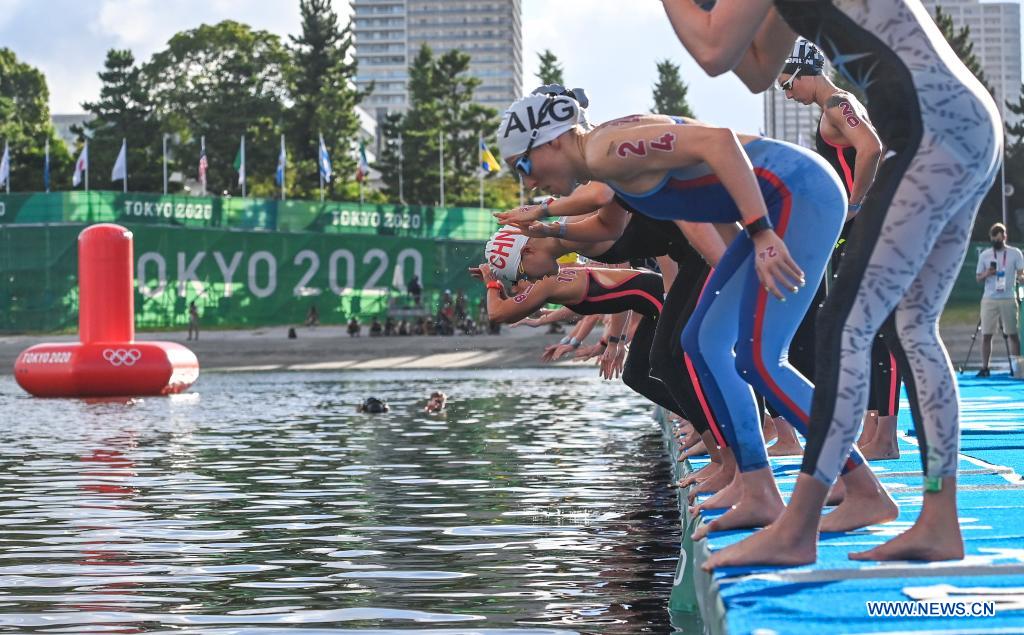 Athletes get prepared at the starting point of the women's 10km of marathon swimming at the Tokyo 2020 Olympic Games in Tokyo, Japan, Aug. 4, 2021. (Xinhua/Xia Yifang)