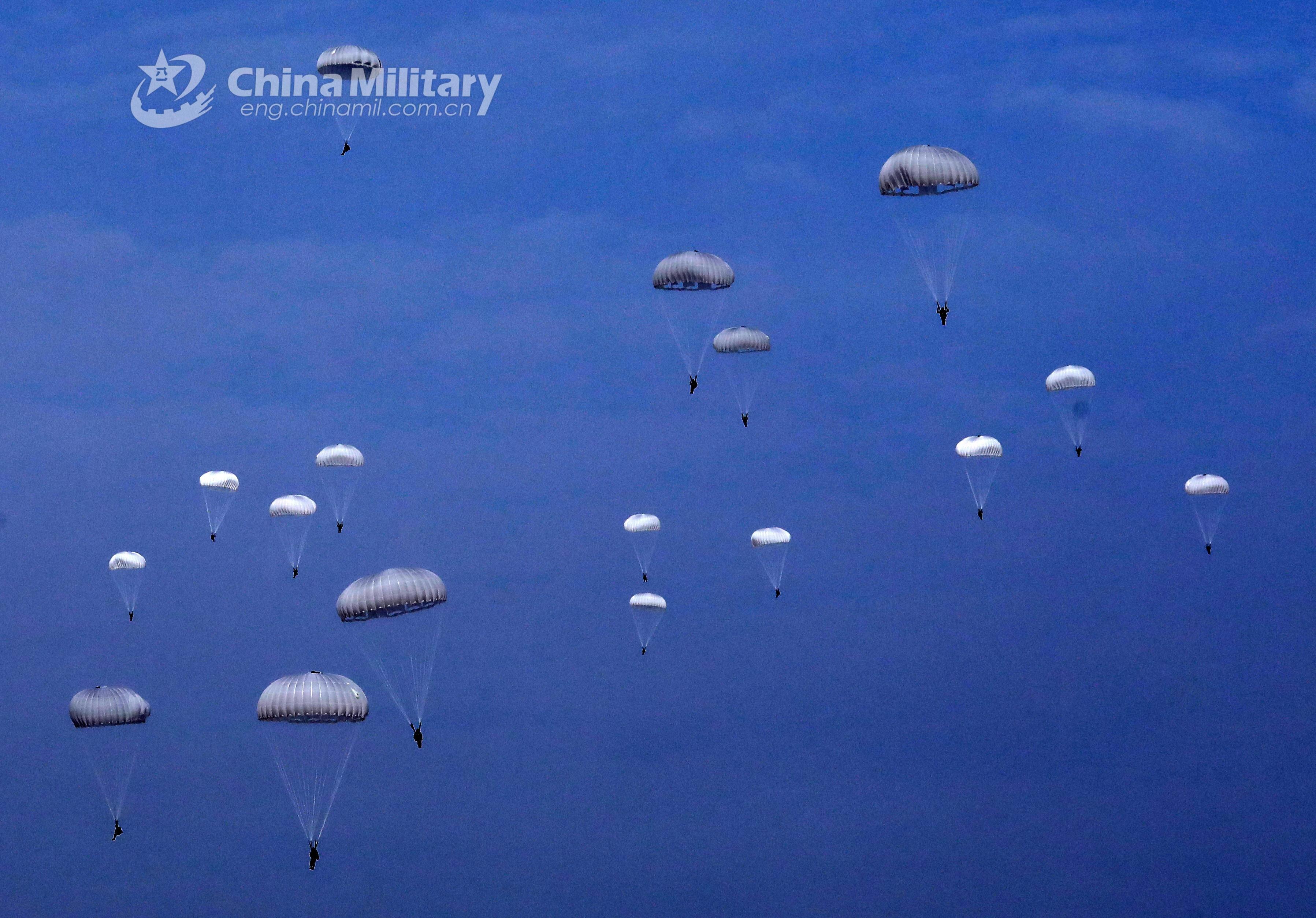 Paratroopers assigned to a brigade under the PLA Air Force’s airborne troops descend to the drop zone after jumping from a transport aircraft during a parachute training exercise in mid-July, 2021. (eng.chinamil.com.cn/Photo by Liu Huan)
