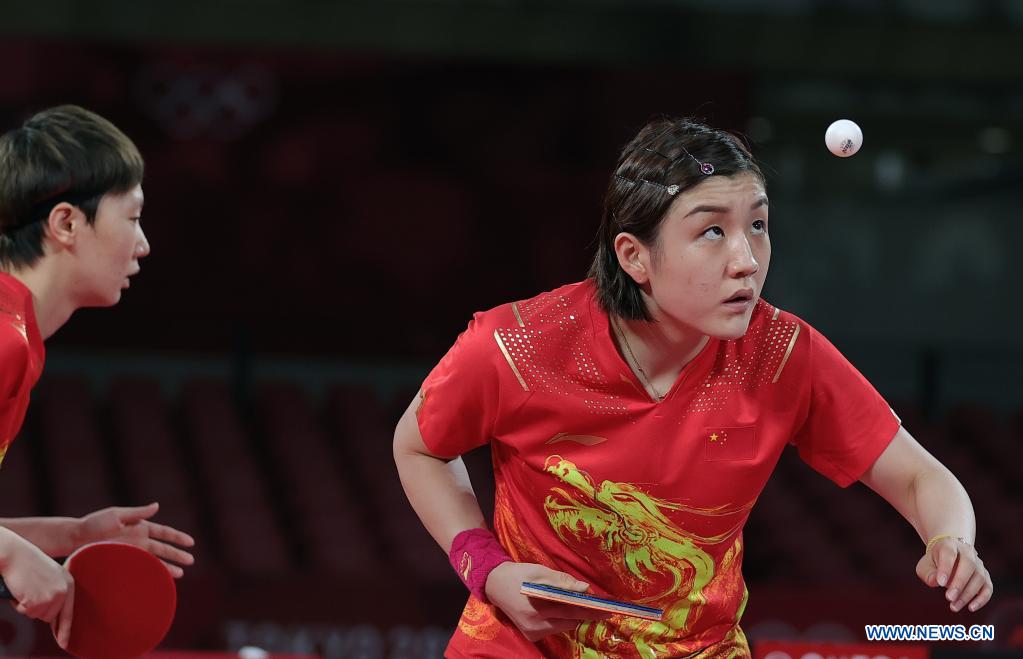 Chen Meng (R) and Wang Manyu of China compete during the table tennis women's team semifinal between China and Germany at the Tokyo 2020 Olympic Games in Tokyo, Japan, Aug. 4, 2021. (Xinhua/Wang Dongzhen)