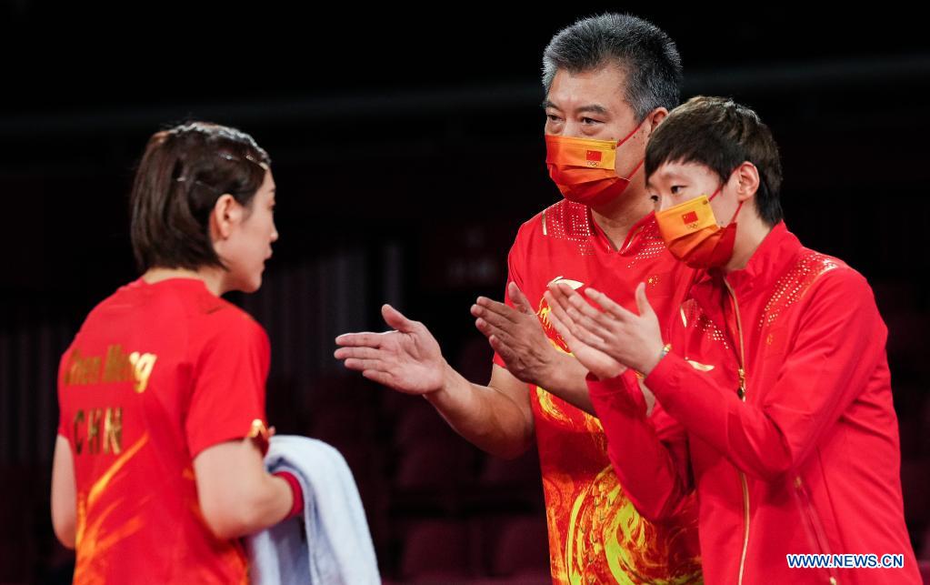 China's coach Li Sun (C) instructs Chen Meng during the table tennis women's team semifinal between China and Germany at the Tokyo 2020 Olympic Games in Tokyo, Japan, Aug. 4, 2021. (Xinhua/Liu Dawei)