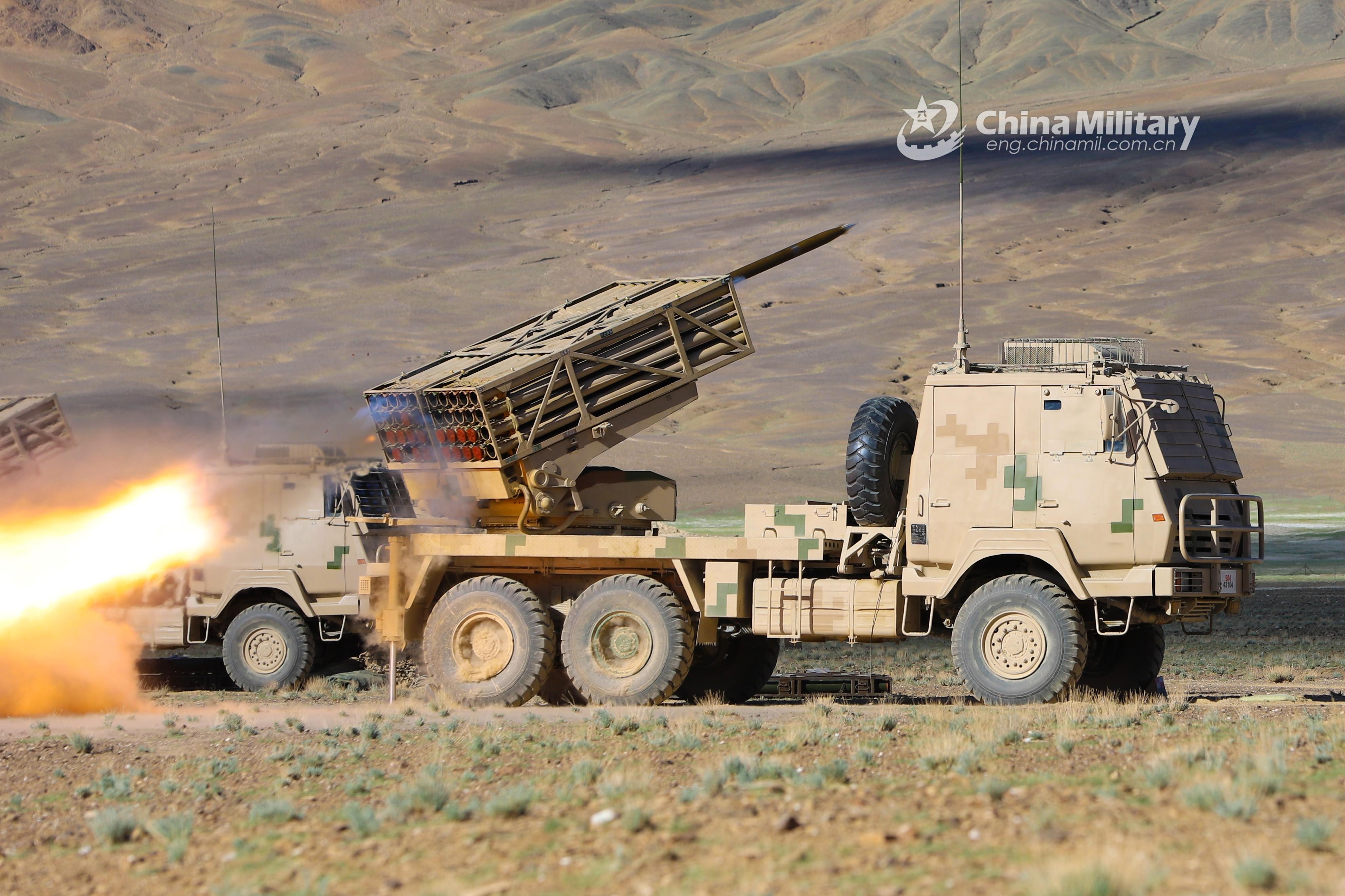 A truck-mounted long-range multiple launch rocket system (LRMLRS) attached to an artillery detachment with a regiment under the PLA Army fires a rocket against the mock target during a live-fire test in July of 2021. (eng.chinamil.com.cn/Photo by Xiang Xudong)