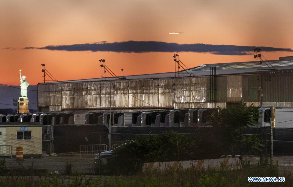 Refrigerated trailers are seen at a temporary morgue in Brooklyn, New York, the United States, June 15, 2021. Global COVID-19 cases surpassed 200 million on Wednesday, according to data from Johns Hopkins University. The global case count amounted to 200,014,602, with 4,252,873 deaths worldwide, as of 3:21 p.m. local time (1921 GMT), showed the data. (Xinhua/Wang Ying)