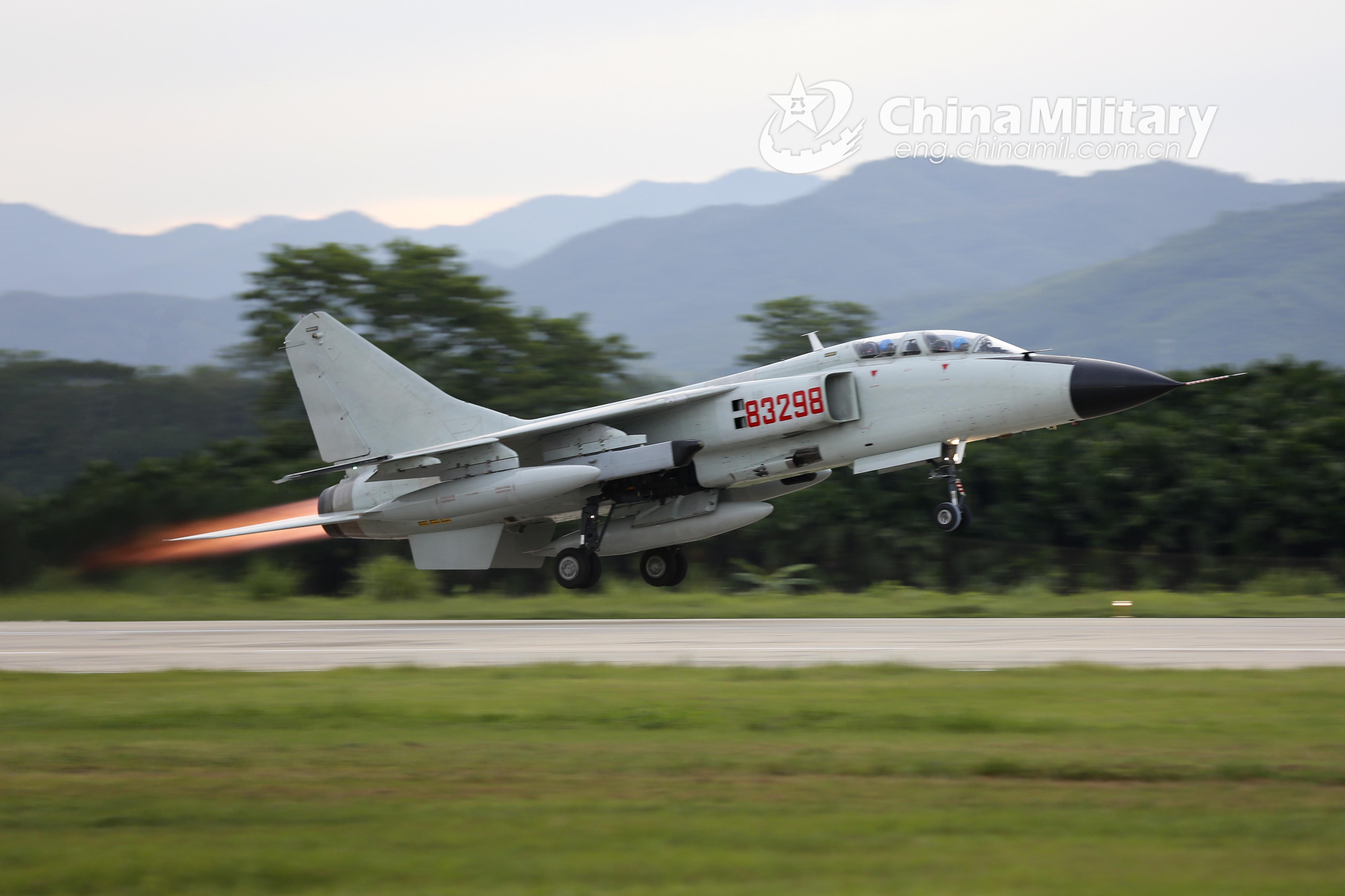 A fighter bomber attached to a naval aviation brigade under the PLA Southern Theater Command takes off for a round-the-clock flight training exercise on July 29, 2021. (eng.chinamil.com.cn/Photo by Nie Haifei)