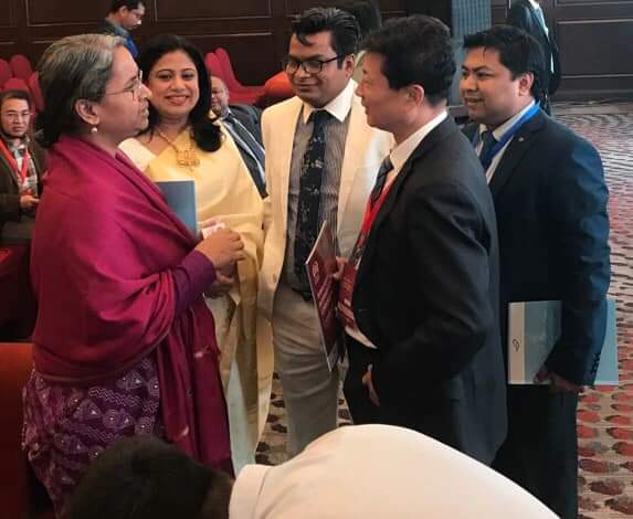 Prof. Wu Yongjian (second from the right) and Dr. Misbahul Ferdous (R) speak with the Education Minister of Bangladesh, Dr. Dipu Moni (L), at the C3 Cadiology Conference in Dhaka, Bangladesh. (Photo provided by the interviewee)