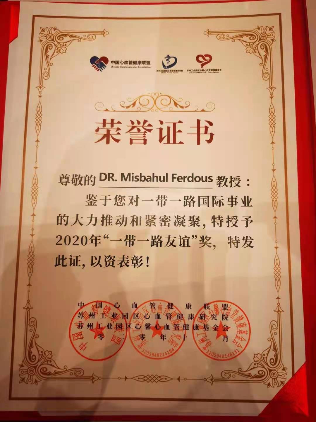 Dr. Misbahul Ferdous receives the "Belt and Road Friendship Award” jointly issued by the Chinese Cardiovascular Association and other organizations. (Photo provided by the interviewee)