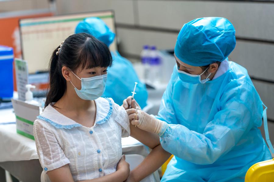 A girl receives a dose of COVID-19 vaccine in Kunming, southwest China's Yunnan Province, Aug. 4, 2021. (Xinhua/Chen Xinbo)