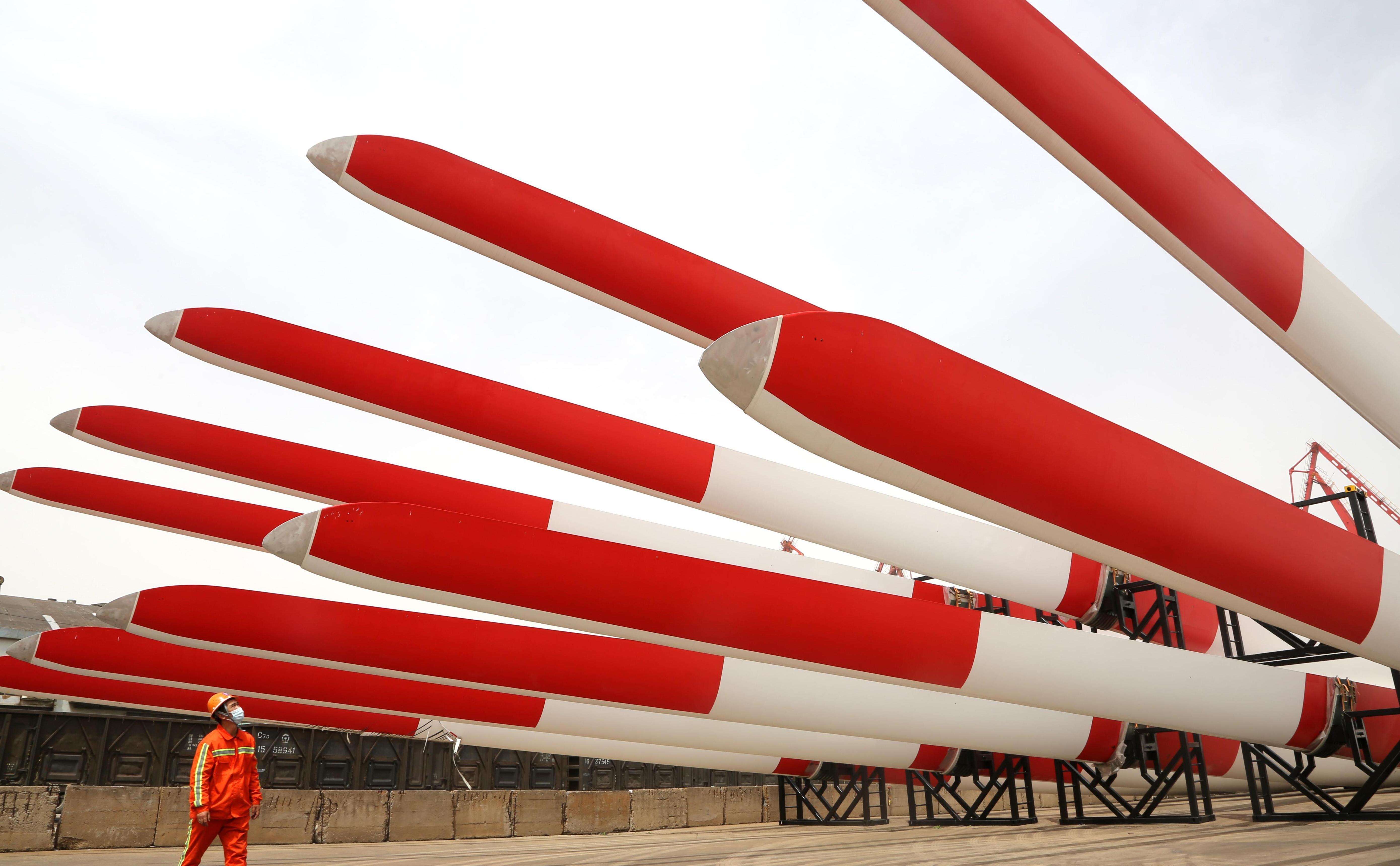 Wind turbine blades wait for shipment at Lianyungang Port, east China's Jiangsu Province, April 16, 2021. (Photo by Wang Chun/Xinhua)
