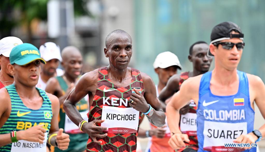 Eliud Kipchoge (C) of Kenya competes during the men's marathon final at the Tokyo 2020 Olympic Games in Sapporo, Japan, Aug. 8, 2021. (Xinhua/Guo Chen)