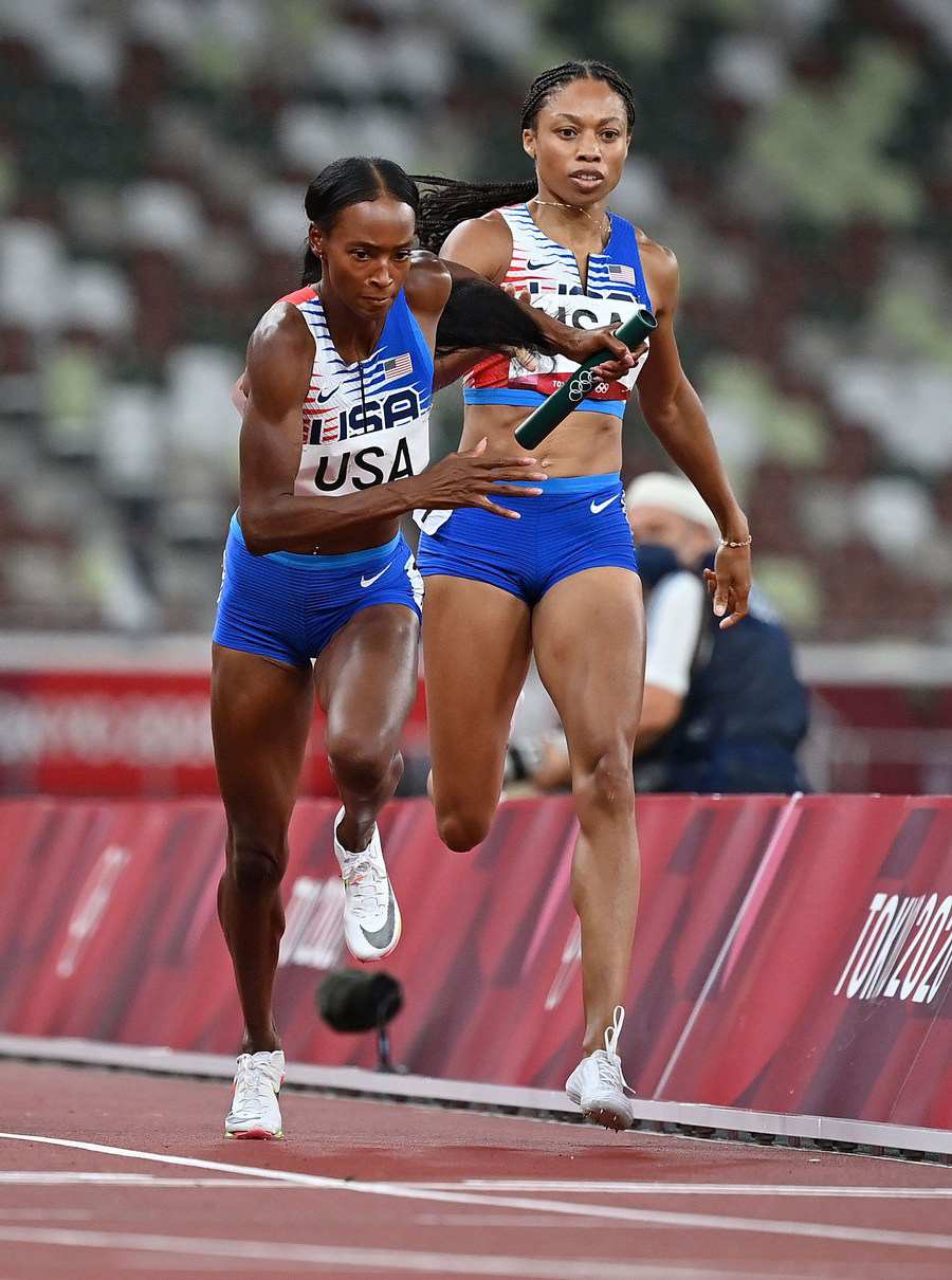 The US quartet, featuring 400m hurdles gold and silver medalists Sydney McLaughlin and Dalilah Muhammad, 400m bronze winner Allyson Felix and 800m champion Athing Mu, finished the race in 3 minutes 16.85 seconds, well ahead of Poland who won silver with a national record of 3:20.53 and Jamaica in 3:21.24.