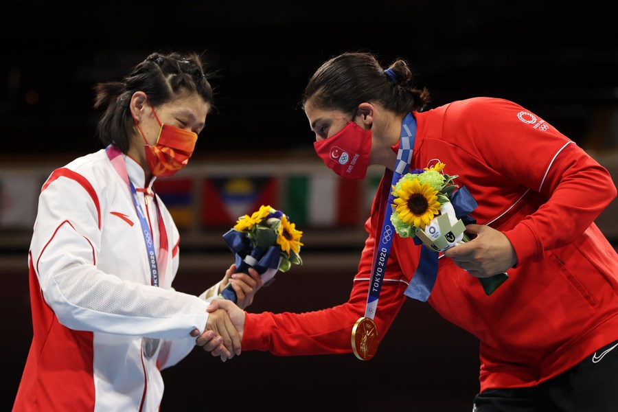 Silver medalist Gu Hong (L) of China greets Busenaz Surmeneli of Turkey during the awarding ceremony for the women's welter (64-69kg) competition of boxing at the Tokyo 2020 Olympic Games in Tokyo, Japan, Aug. 7, 2021. (Xinhua/Ou Dongqu)