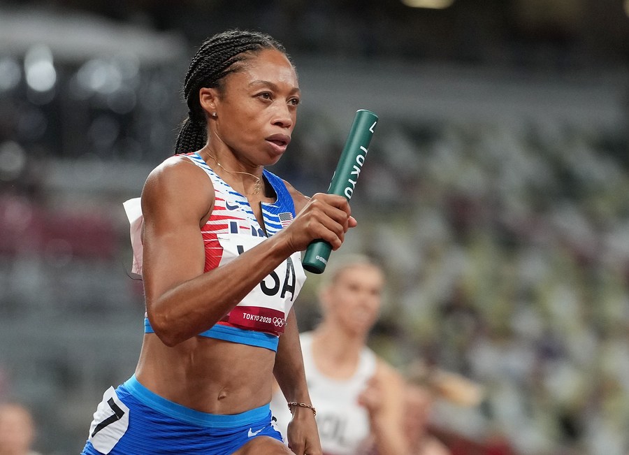 Allyson Felix of the United States competes during the Women's 4x400m Final at the Tokyo 2020 Olympic Games in Tokyo, Japan, Aug. 7, 2021. (Xinhua/Li Yibo)