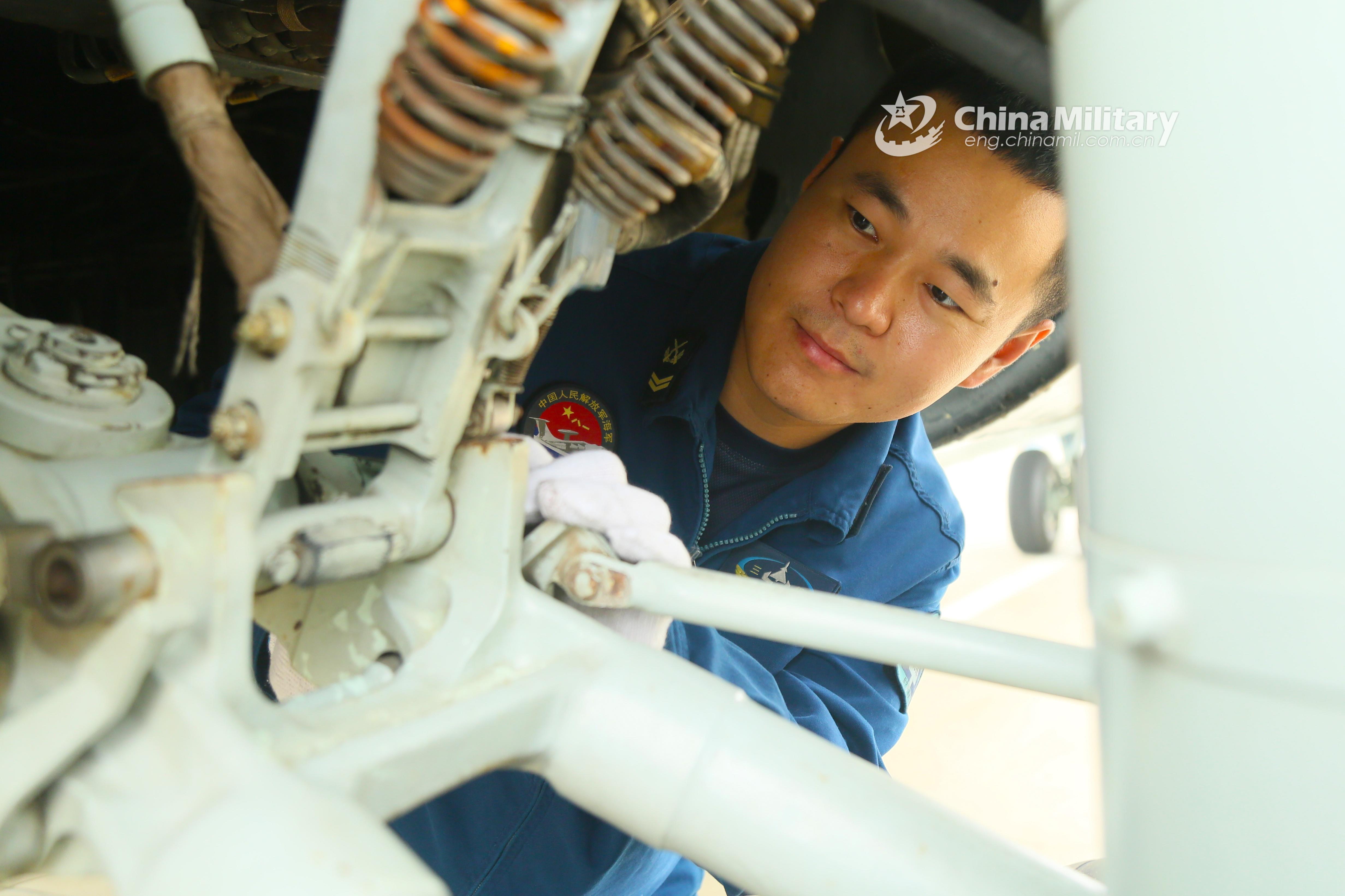 A maintenance man assigned to a naval aviation unit under the PLA Northern Theater Command checks the undercarriage of an aircraft prior to a round-the-clock flight training exercise in east China's Shandong Province in early August, 2021. (eng.chinamil.com.cn/Photo by Xing Yun and Duan Yanbing)