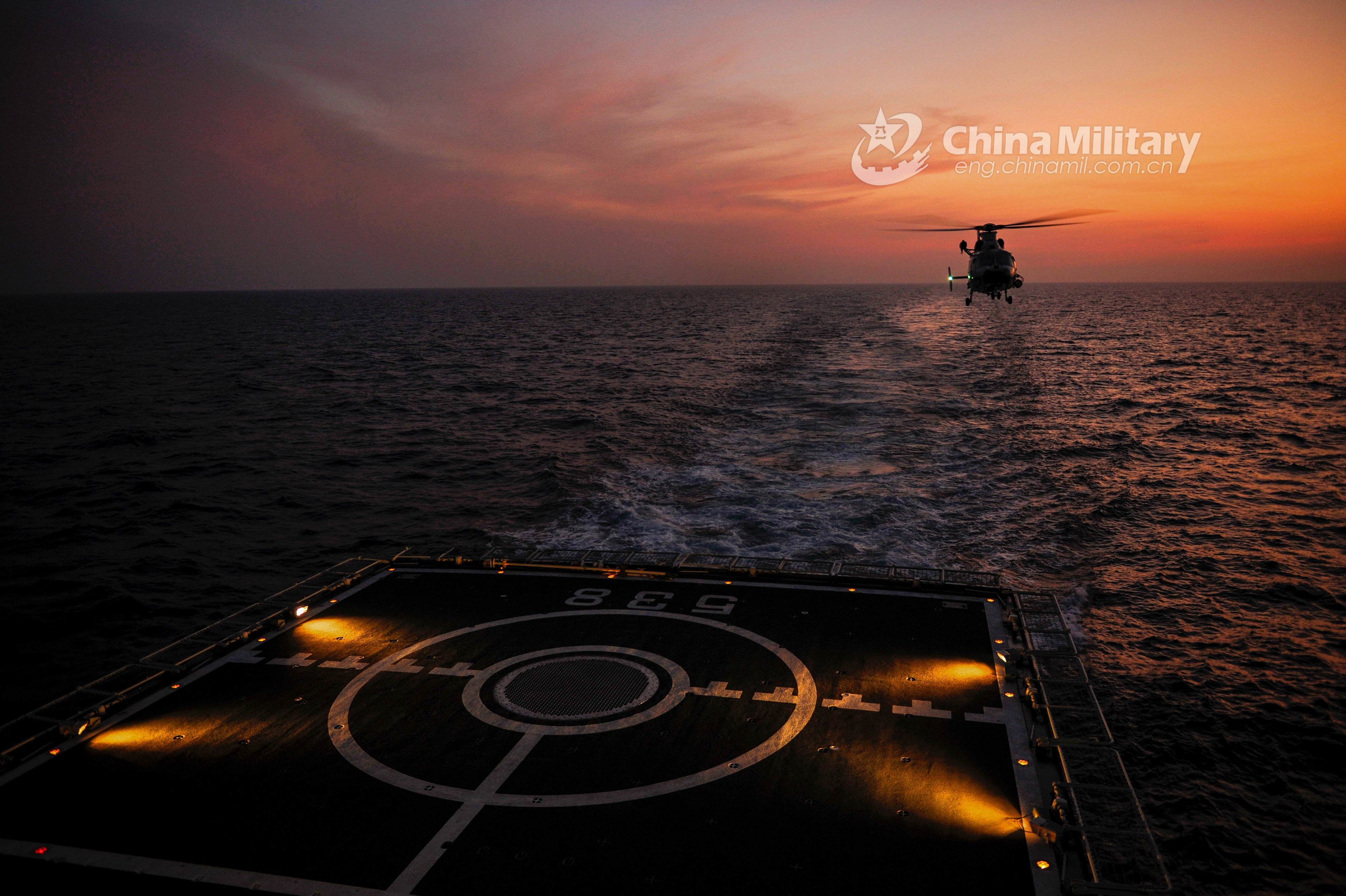 A ship-borne helicopter attached to a destroyer flotilla with the navy under the PLA Northern Theater Command lifts off from the flight deck of the guided-missile frigate Yantai (Hull 538) during a maritime cooperative training exercise in waters of the Yellow Sea in late July. The training exercise focused on subjects including striking maritime and aerial targets, joint search and rescue, anti-submarine operation, warship and airplane cooperative training. (eng.chinamil.com.cn/Photo by Du Jiangfan)
