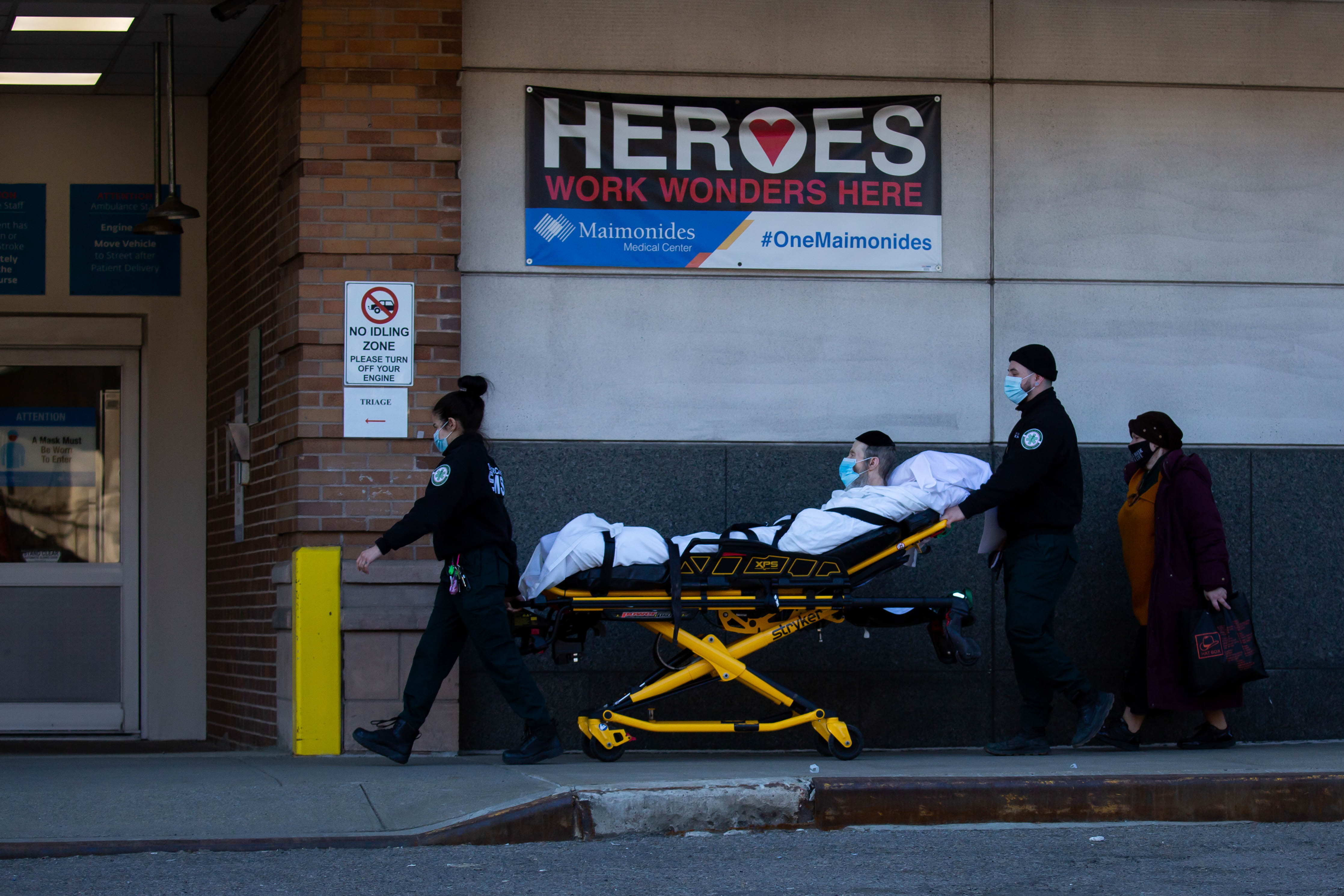 Medical workers wheel a patient into the emergency room at Maimonides Medical Center in the Brooklyn borough of New York, United States, March 8, 2021. (Xinhua/Michael Nagle)