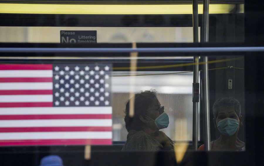 Passengers with face masks are seen in a bus in New York City, the United States, Aug. 2, 2021. (Xinhua/Wang Ying)