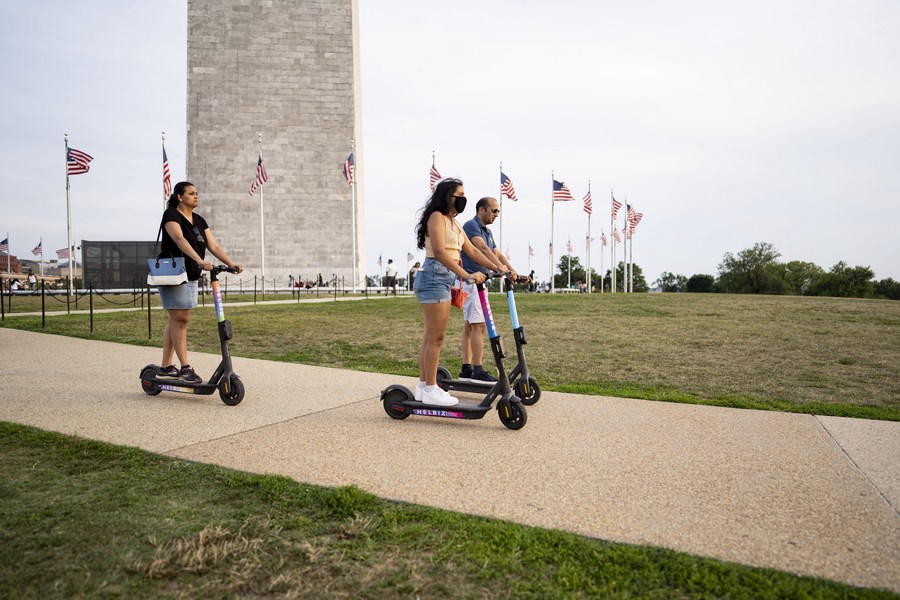 People visit the Washington Monument in Washington, D.C., the United States, Aug. 6, 2021. (Xinhua/Liu Jie)