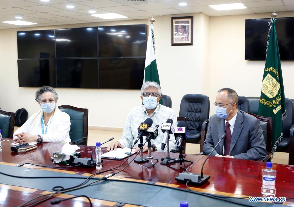 Chinese Ambassador to Pakistan Nong Rong (R) and Special Assistant to the Pakistani Prime Minister on Health Faisal Sultan (C) attend a handover ceremony of Chinese Sinopharm COVID-19 vaccines shipped via the COVAX facility in Islamabad, capital of Pakistan, Aug. 12, 2021. The first batch of COVID-19 vaccine that China provided to the COVAX facility was officially handed over to Pakistan during a ceremony held here on Thursday. Early Wednesday morning, a batch of over 970,000 doses of Chinese Sinopharm COVID-19 vaccine arrived at Islamabad International Airport. (Xinhua/Ahmad Kamal)