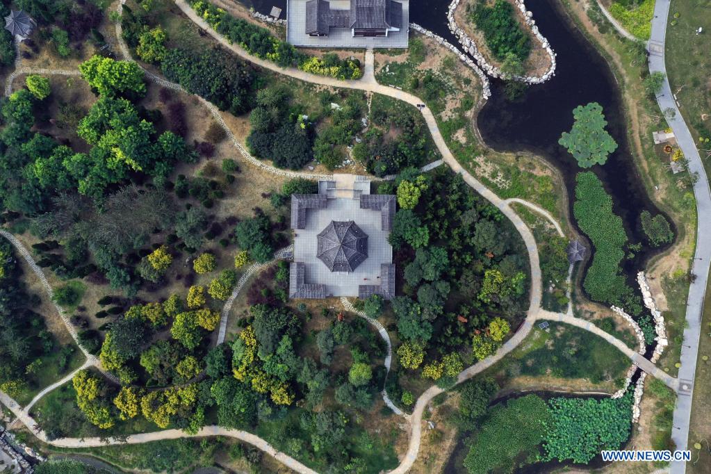 Aerial photo taken on Aug. 11, 2021 shows a park in Hejian City, north China's Hebei Province. In recent years, more than 20 parks have been built in the city along with its ecological development drive. (Xinhua/Luo Xuefeng)