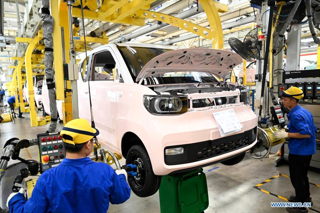Staff members work on the production line of new energy vehicle at an automobile company in Liuzhou, south China's Guangxi Zhuang Autonomous Region, Aug. 12, 2021. Liuzhou City has seen 199 thousand new energy vehicles sold from January to June in 2021. The city has been implementing measures to encourage research and development (R&D) and promote production capacity in a bid to boost its new energy automobile industry in recent years. (Photo by Li Hanchi/Xinhua)