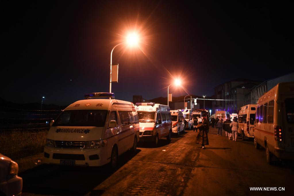 Rescue vehicles are seen at the site of a coal mine accident in Haibei Tibetan Autonomous Prefecture, northwest China's Qinghai Province, Aug. 14, 2021. China's Ministry of Emergency Management has sent a work team to the northwest province of Qinghai to guide rescue efforts after a coal mine was flooded by mud on Saturday. Of the 21 miners working in the mine when the accident occurred, two were lifted to the ground, including one who was confirmed dead, while the rest remained trapped, according to the ministry. Rescue operations are underway as more rescuers rushed to the site. (Xinhua/Wu Gang)
