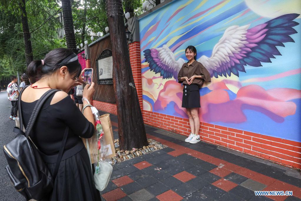 A woman poses for photos in front of a mural painting themed on romantic art in Shanghai, east China, Aug. 14, 2021. The Qixi festival, or Chinese Valentine's Day, falls on Aug. 14 this year. (Xinhua/Wang Xiang)