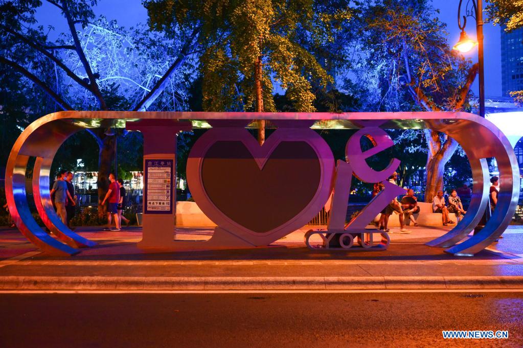 Photo taken on Aug. 14, 2021 shows a heart-shaped bus station in Chengdu, capital of southwest China's Sichuan Province. The Qixi festival, or Chinese Valentine's Day, falls on Aug. 14 this year. (Xinhua/Xu Bingjie)