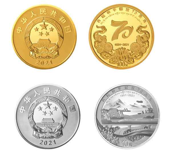 Both coins feature the national emblem, the country name and year of issuance on the obverse, while the reverse is inscribed with combinations of different pictures, denominations, "1951-2021," and a line that reads "the 70th anniversary of the peaceful liberation of Tibet" in both Chinese and Tibetan languages.