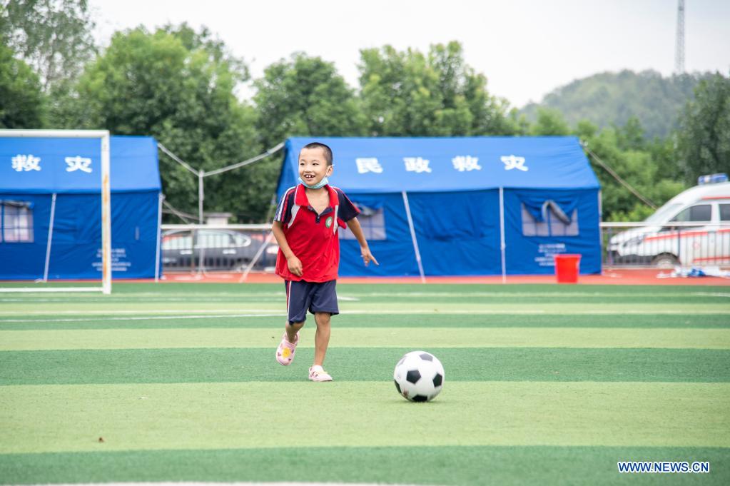 A child plays soccer at a temporary shelter on the playground of a school in Liulin Township in Suizhou, central China's Hubei Province, Aug. 14, 2021. Over 8,000 people have been affected in the township hit by heavy rainfall. (Photo by Wu Zhizun/Xinhua)