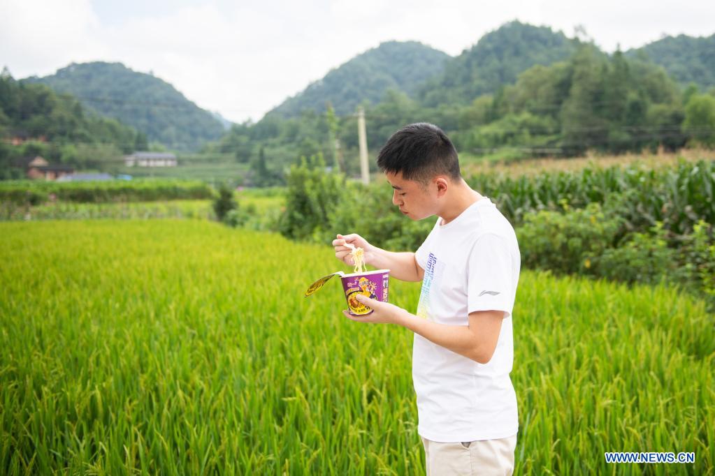 Luo Jinwu eats instant noodles as lunch in Yangping Village of Yongding District in Zhangjiajie City, central China's Hunan Province, Aug. 12, 2021. Luo Jinwu and his wife Xiang Ka are medical workers from Zhangjiajie Hospital of Traditional Chinese Medicine. Since the recent resurgence of COVID-19 in Zhangjiajie from July 29, Luo has been conducting nucleic acid tests especially in the countryside, while Xiang has stationed in the hospital to attend to patients. Being apart for about half a month, the couple kept in contact via video link. "Both of us understand the heavy workload we bear at the front line of epidemic prevention and control," Xiang said, hoping the coronavirus resurgence will soon be deterred and they can be reunited. (Xinhua/Chen Sihan)