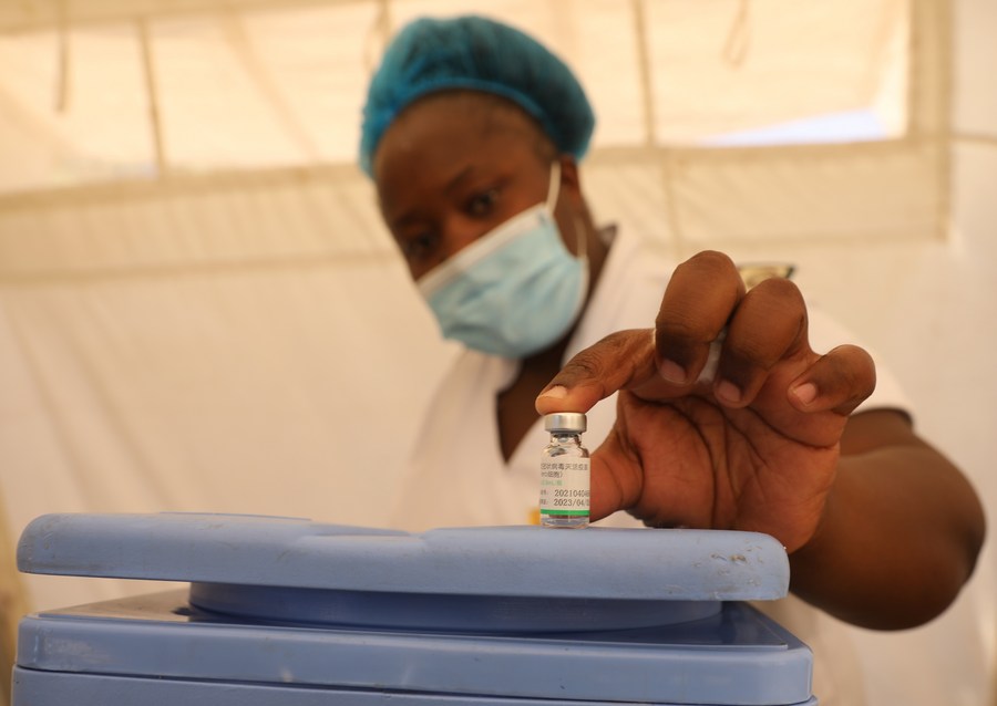 A nurse shows a vial of Sinopharm COVID-19 vaccine at Parirenyatwa Group of Hospitals in Harare, capital of Zimbabwe, July 8, 2021. (Photo by Shaun Jusa/Xinhua)