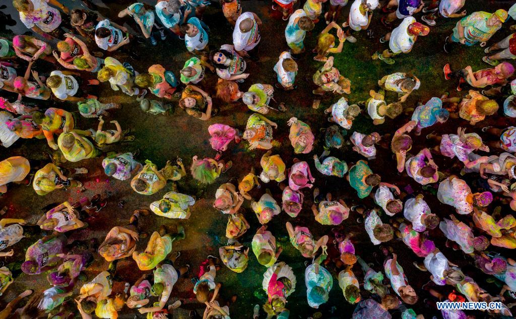 People take part in a color festival in Jurmala, Latvia, on Aug. 15, 2021. (Photo by Edijs Palens/Xinhua)