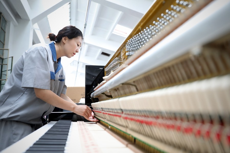 A worker assembles and adjusts a piano at Dongbei Piano Musical Instruments Co., Ltd. in Yingkou, northeast China's Liaoning Province, July 14, 2021. (Xinhua/Yao Jianfeng)