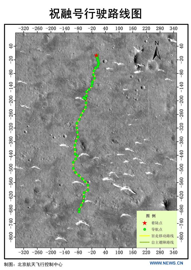 Image shows the road map of China's Mars rover Zhurong. China's Mars rover Zhurong has accomplished its exploration and detection tasks as planned, according to the China National Space Administration (CNSA) on Tuesday. As of Aug. 15, 2021, Zhurong had worked on the surface of Mars for 90 Martian days, or about 92 days on Earth, with all scientific payloads having started to work on detection tasks, said the administration. The CNSA added that the rover will continue to move to the boundary zone between the ancient sea and the ancient land in the southern part of Utopia Planitia, and will carry out additional tasks. (CNSA/Handout via Xinhua)