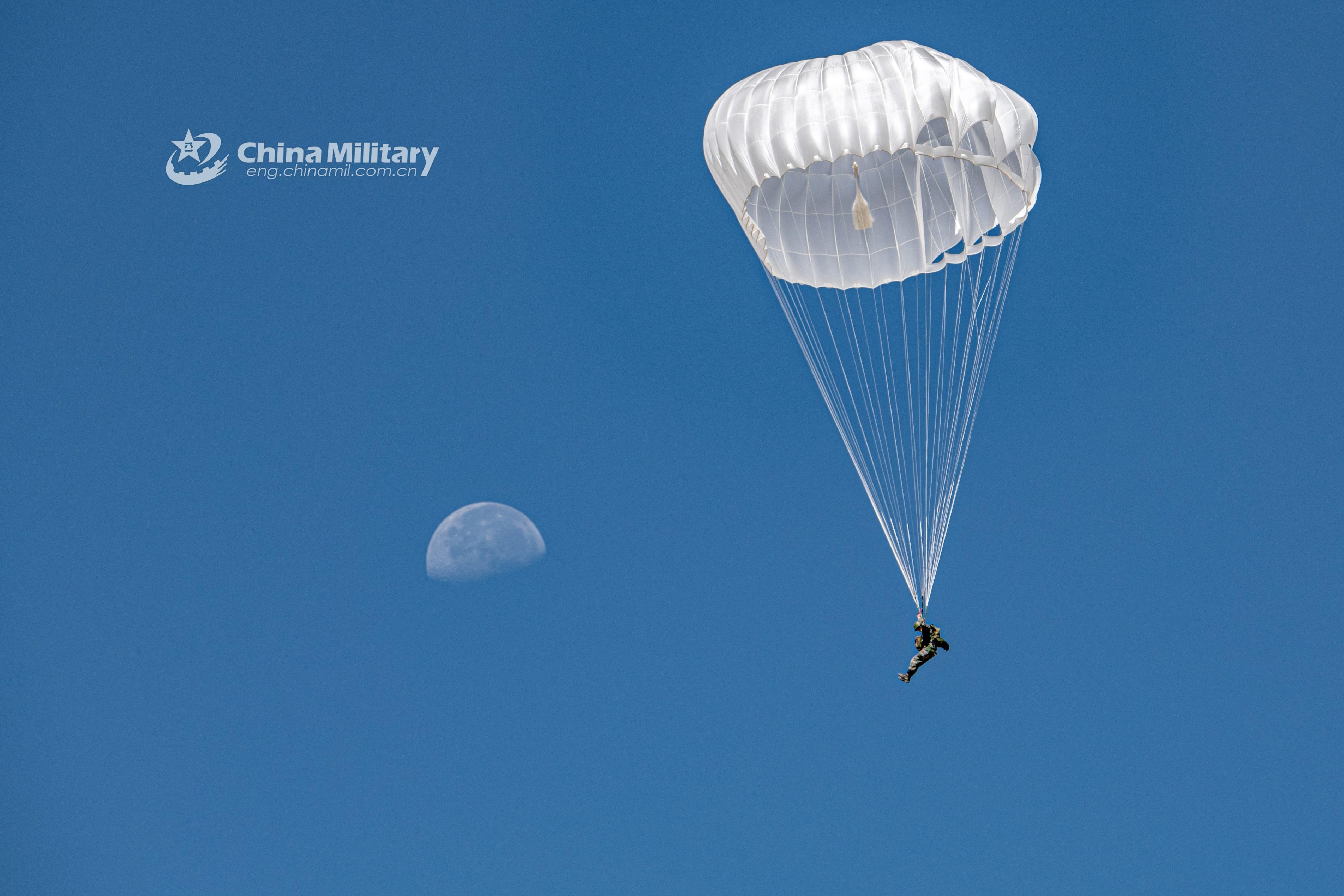 A paratrooper assigned to a special operations brigade under the PLA Tibet Military Command opens his parachute while descending to the drop zone after jumping out of a transport helicopter during a training exercise on July 30, 2021. This exercise effectively beefed up the paratroopers’ multi-dimensional assault and penetrating strike capabilities on plateau. (eng.chinamil.com.cn/Photo by Wang Shudong)