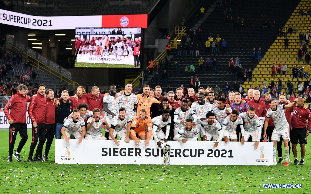 Members of Bayern Munich celebrate during the awarding ceremony after the German Supercup football match between Borussia Dortmund and FC Bayern Munich in Dortmund, Germany, Aug. 17, 2021. (Photo by Ulrich Hufnagel/Xinhua)