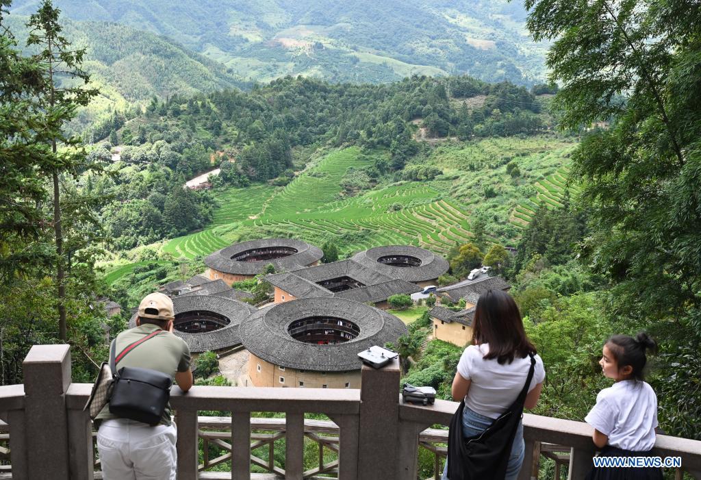 Tourists view Tianluokeng Tulou cluster in Nanjing County, southeast China's Fujian Province, Aug. 17, 2021. Relying on Tulou, the unique residential architecture of Fujian Province which was inscribed on the UNESCO's World Heritage List in 2008, Nanjing County has found a sustainable way to develop the rural tourism industry and boost the local economy. (Xinhua/Song Weiwei)