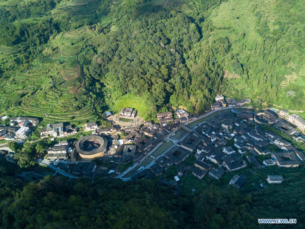 Aerial photo taken on Aug. 16, 2021 shows a view of Nanjing County, southeast China's Fujian Province. Relying on Tulou, the unique residential architecture of Fujian Province which was inscribed on the UNESCO's World Heritage List in 2008, Nanjing County has found a sustainable way to develop the rural tourism industry and boost the local economy. (Xinhua/Song Weiwei)