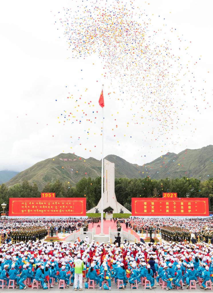 Balloons are released during a grand gathering to celebrate the 70th anniversary of the peaceful liberation of Tibet at the Potala Palace square in Lhasa, southwest China's Tibet Autonomous Region, Aug. 19, 2021. More than 20,000 people from various ethnic groups attended the event held in Lhasa. (Xinhua/Huang Jingwen)
