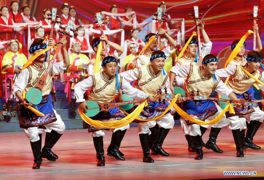 A grand gala is held in celebration of the 70th anniversary of the peaceful liberation of Tibet, in Lhasa, capital of southwest China's Tibet Autonomous Region, Aug. 19, 2021. (Xinhua/Huang Jingwen)